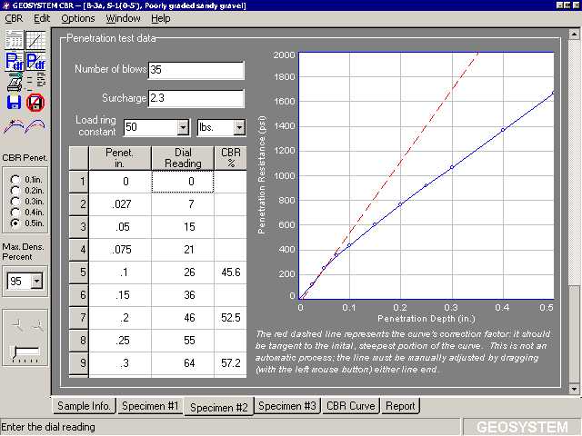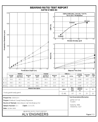 values and plots reports featuring stress vs. penetration, CBR vs. density and