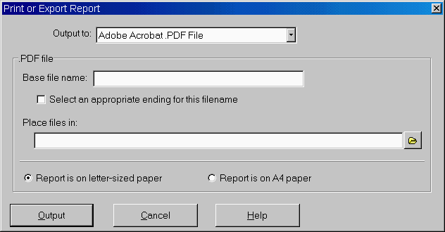 When the program creates a file from one page your report (for .DXF, .EMF, .PNG and .JPEG files), or from your entire report (for .PDF files), the file's name will start with whatever is entered into this field.