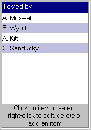 To use the feature, right-click on a data entry field on one of the programs' Sample Info. windows then select Make a Selection List. This shows an empty selection list box that you'll need to fill with selection entries (such as personnel names, or your test remarks boilerplate text). Right-click within the empty selection list and select Edit, Delete and Add Entries. When you've done the program will show the Selection List Editor dialog: