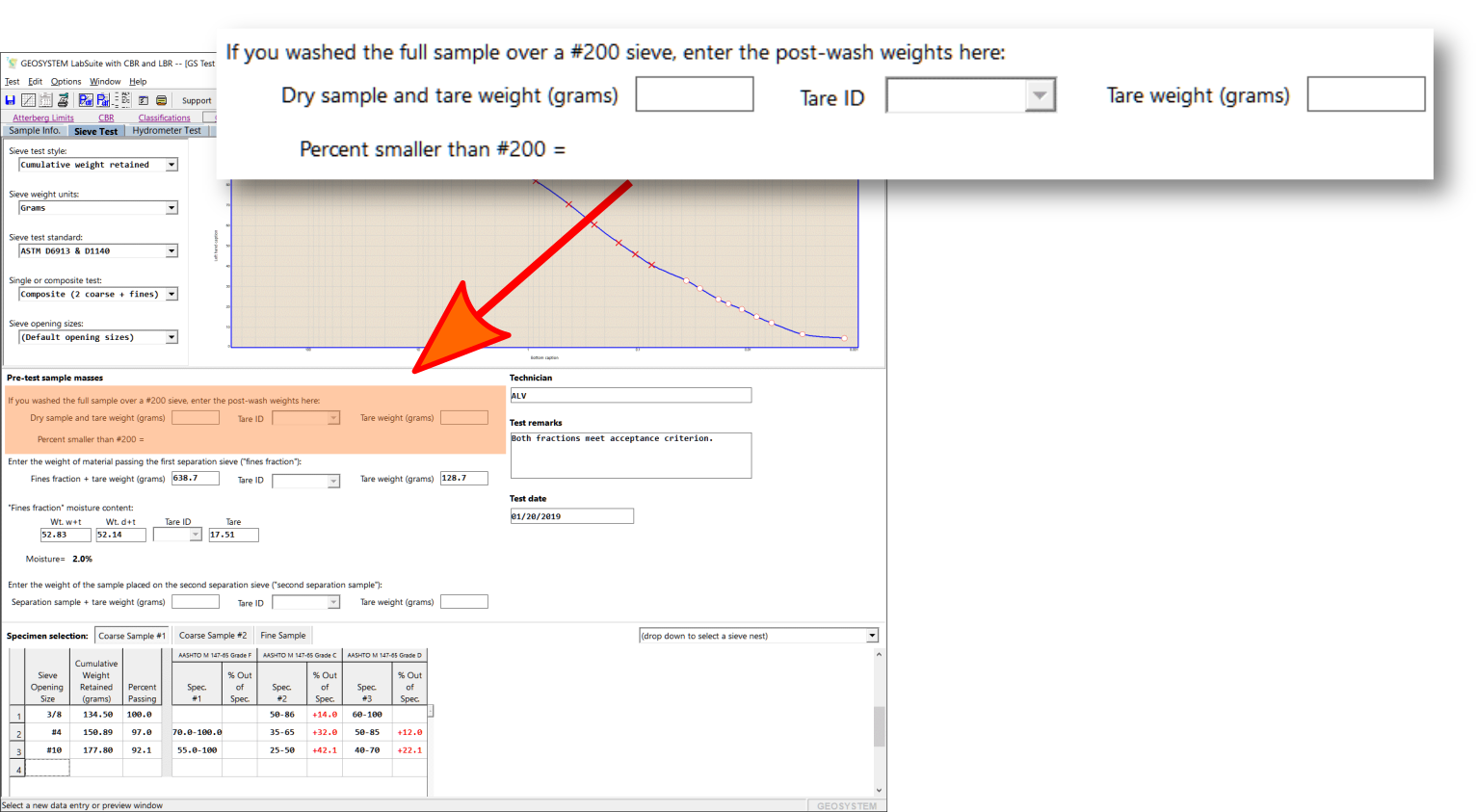 If you washed your entire test sample over a #200 sieve before doing the sieve test, by entering the after-wash sample weights into the boxes under the If you washed the sample over a #200 sieve, enter the post-wash weights here heading . LabSuite uses your #200 wash data as follows: