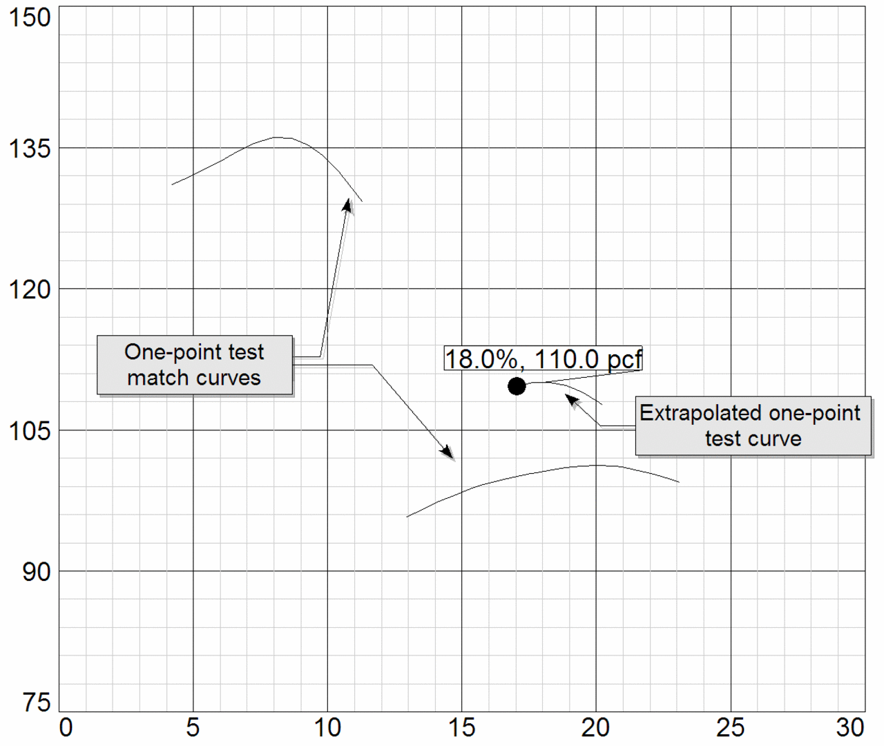 LabSuite supports a simplified version of the AASHTO T 272 one-point test matching procedure that extrapolates a one-point test's compaction curve from a pair of existing tests' compaction curves. For one-point tests that have an extrapolated compaction curve, LabSuite can be configured to plot the extrapolated compaction curve (by checking the Draw extrapolated one-point curves on chart reports box) and/or the pair of existing tests' compaction curves (by checking the Draw one-point test match curves on chart reports box).