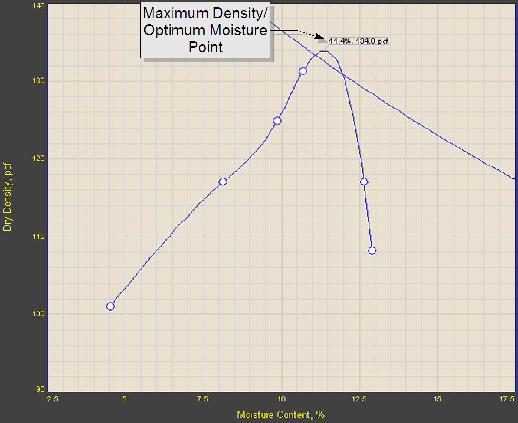 Selecting this option adds a small call-out box to the moisture-density chart pointing to the point of maximum density/optimum moisture. The selection is required by many test standards (e.g., ASTM D698).