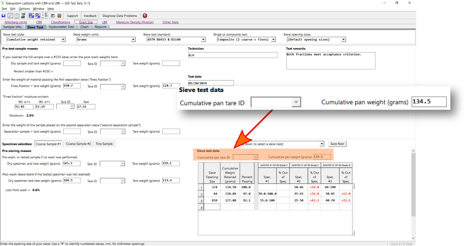 - If you're using the cumulative weight retained test style, you'll need to enter the weight of the cumulative pan with the sieve's retained material.
