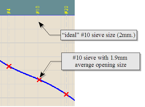 As an example, the following image is taken from a section of a particle size distribution chart. The standard sieve sizes listed at the top of the chart are always drawn at the hypothetical exact opening size (4.7mm. for the #4, 2mm. for the #10 and 0.85mm. for the #20). Within the chart are three points from a curve: notice that the left and right points fall directly on the vertical lines that LabSuite drew to denote the exact #4 and #20 opening sizes, while the point in the middle falls somewhat to the right of the #10 line: When this test was entered, the measured dimension of the #10 sieve used for the test was noted as being 1.9mm.; the #4 and #20 sieves were left as-is.