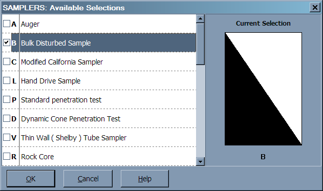 Once you've determined that the project measurement system is in US units you still need to figure out whether you need to enter the sample lengths feet or inches -- the prompt next to the sampling length data entry field should indicate which to enter (usually it says something like Sample length (in. or cm.)). - Many data entry forms also include a field for choosing a symbolic representation for the type of sampler used -- this field is usually labeled Sample Type and is followed by a small button. Clicking on the button displays a dialog listing all of the different sampler types that the program supports.
