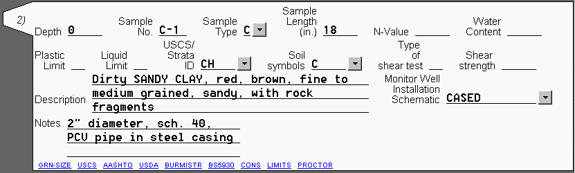 A source's tabulated section is composed of a list of cards. A single card holds all of the information taken at a single depth below ground, including: sampling data, the material description, testing data such as the material's plastic and liquid limit and any monitoring well sections placed at that depth. A sample card follows (this figure displays a complete data entry screen, including several cards):
