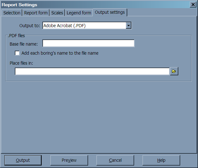 - Because .PDF files can combine reports from multiple borings, test pits, etc. into a single file, the Add each boring's name to the file name option is disabled when Adobe Acrobat .PDF File is selected as the report output format.