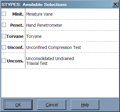 You may want to limit the information entered into certain data entry fields on a LOGDRAFT subsurface table to a small set of choices. As an example, a Shear test type data entry field might be limited to a set of standardized test type labels:Minit.