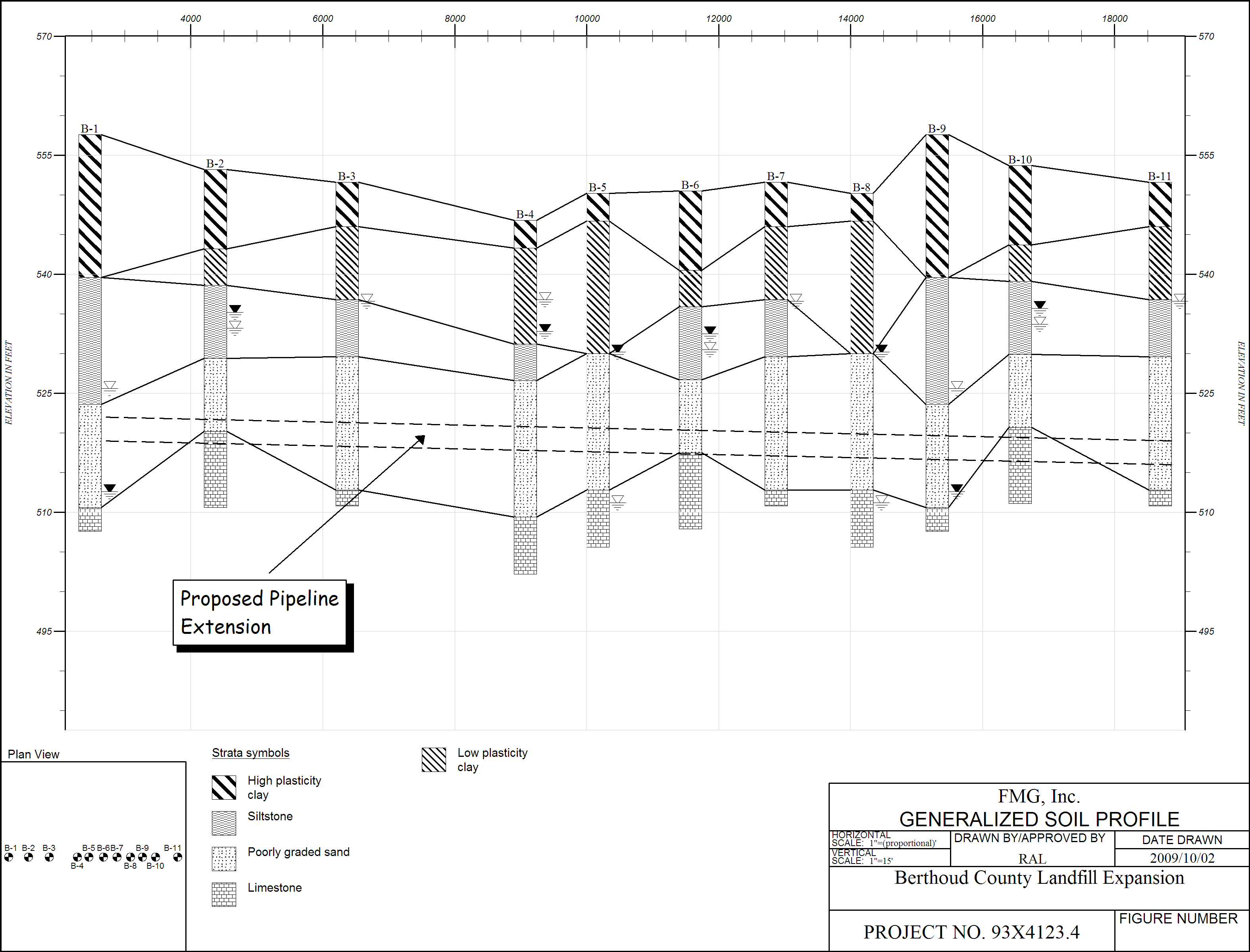 In addition to generating reports featuring one subsurface boring per page, LOGDRAFT also generates subsurface profiles, which are reports that can show more than one boring on a single page. A sample profile, complete with custom annotations, is shown below.