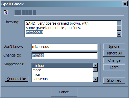 LOGDRAFT can spell check an entire project at a single pass, or just a single source. Note, however, that you cannot spell check data that you have entered into any of the program's laboratory testing modules.