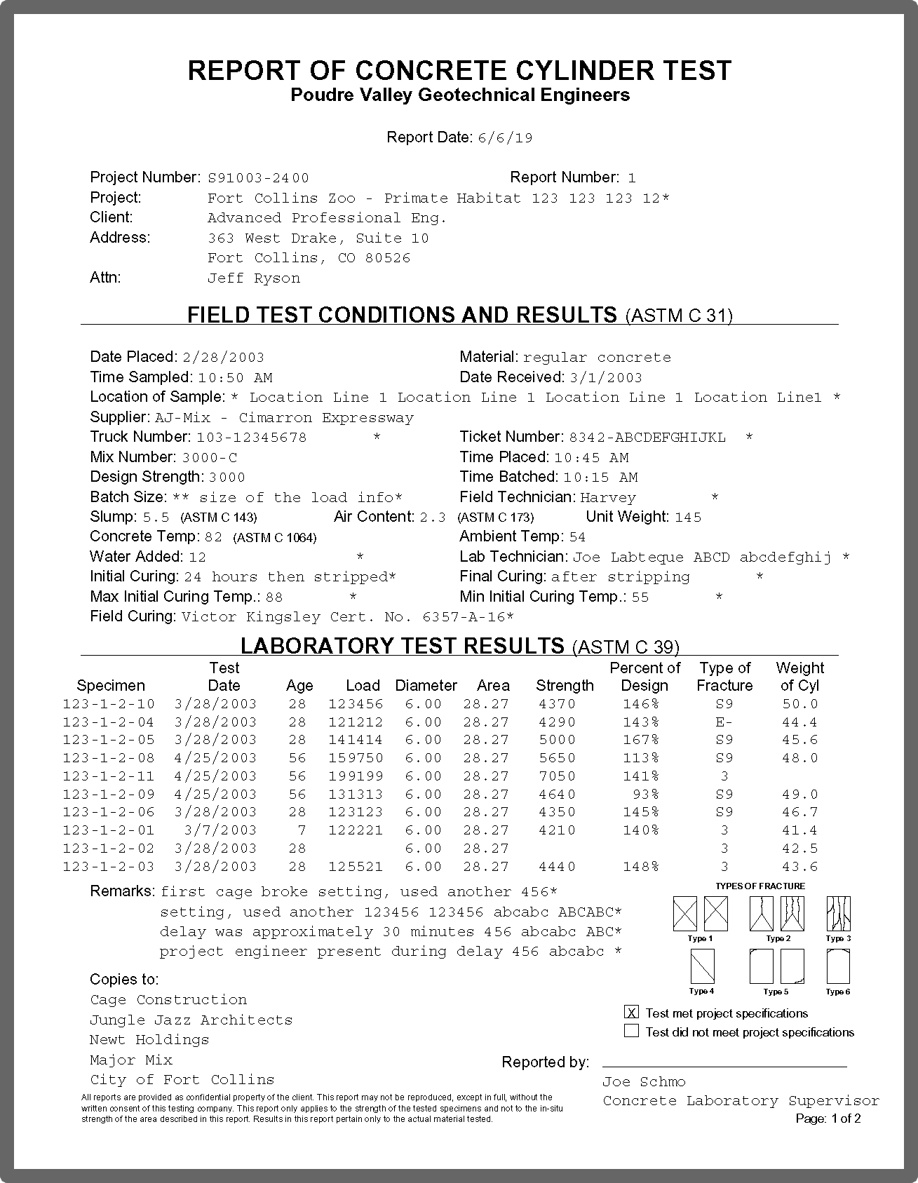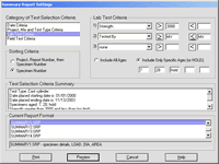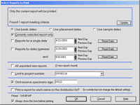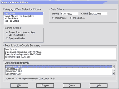 Testing summary reports list all specimens broken based on user specified selection criteria. (These reports are useful for invoicing or project summary purposes.) Many summary report formats are included with the standard package, and custom reports may be designed.