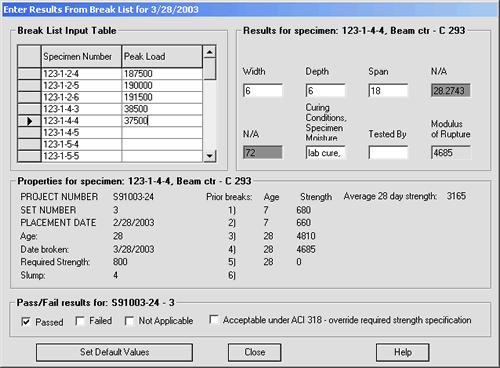 QC-Concrete gives you a quick and easy way to enter a day's break results. The Break List Data Entry screen lists the specimens scheduled to be broken on a given day, in the same order as they are printed on a QC-Concrete break list.
