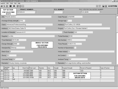 The GEOSYSTEM Quality Control - Concrete (QC-Concrete) program maintains strength and property testing data on cement products, including concrete cylinders and beams, and mortar and grout cubes. It delivers client submittal and in-house tracking reports and lets you print lists of all specimens to be broken on a given day. Reports comply with all applicable ASTM and AASHTO reporting requirements.