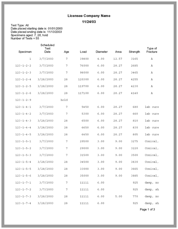 QC-Concrete ships with report forms specifically designed for all common cement products tests, including variants that reserve form space for letterhead printing. We also offer a fee-based report customization service for licensees with specific reporting requirements.