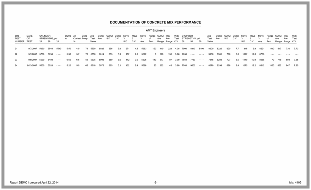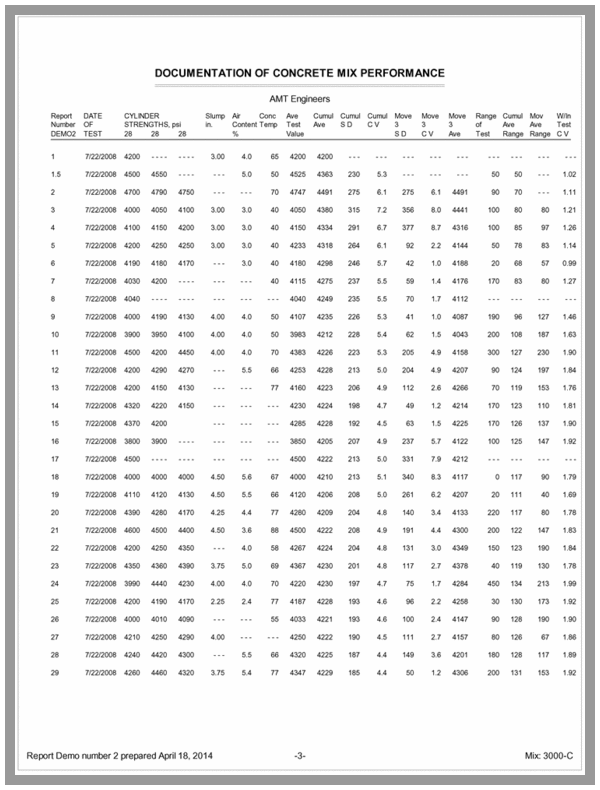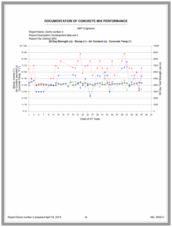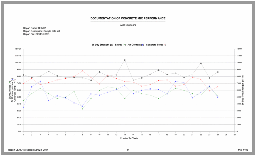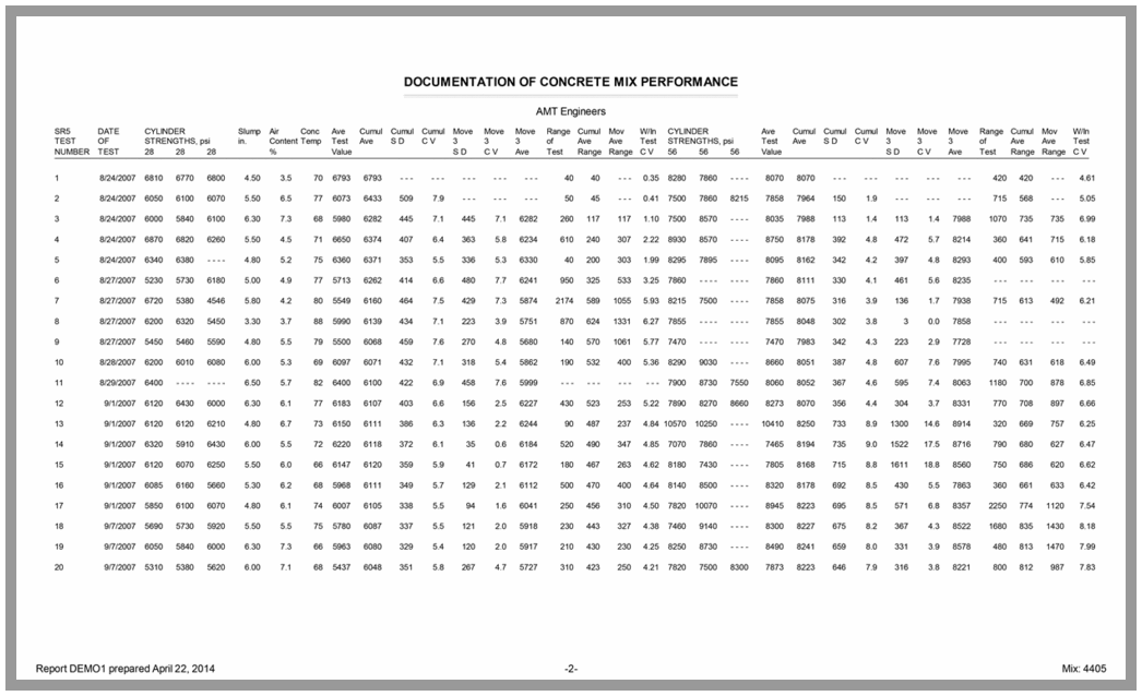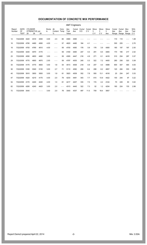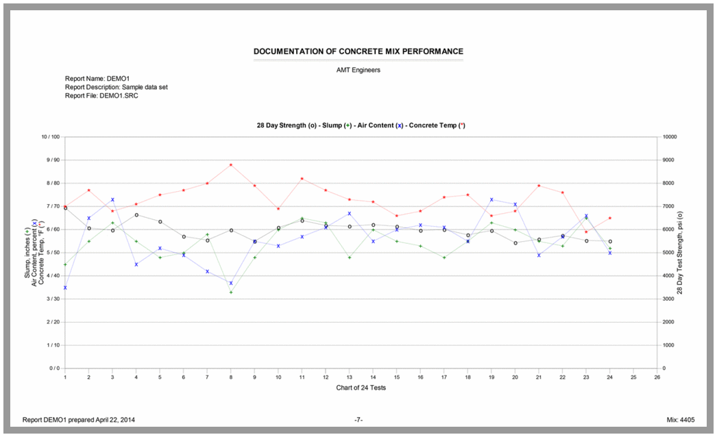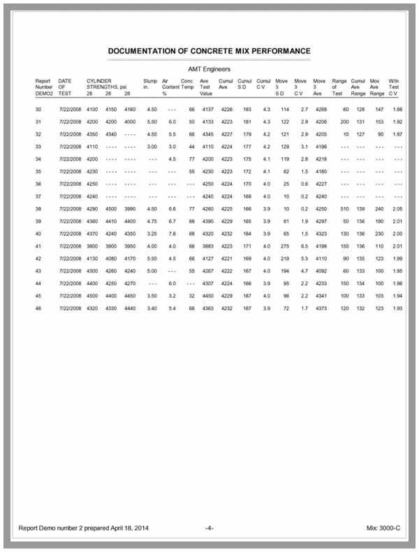 - Non-statistical items reported can include specimen strengths, test result, slump, air, and temperature