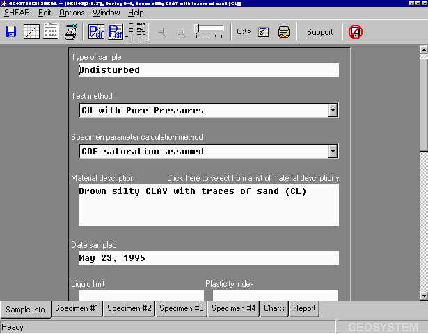 This program reduces the data from triaxial shear, direct shear and unconfined compression tests. Support is included for triaxial pore pressure or drained test buret readings and for vertical deformation readings taken during direct shear testing. SHEAR is compatible with both Corps of Engineers and ASTM testing procedures and will also handle staged (single specimen, multiple shear runs at different normal or confining stresses) and geomembrane tests.